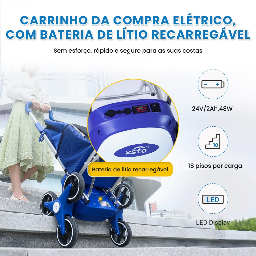 Carrinho de compras elétrico para subir escadas. Um carrinho ideal para o transporte de compras de supermercado, o seu mecanismo permite-lhe subir escadas de forma fácil e cómoda. A sua capacidade de carga até 30 kg permite o transporte de diferentes tipos de produtos, tais como compras de supermercado, garrafas de água, produtos de escritório, etc. O seu cesto pode ser dobrado e desdobrado para se adaptar a cada necessidade. A sua bateria de lítio recarregável torna-o perfeito para ser utilizado em qualquer altura sem dificuldade de carregamento.