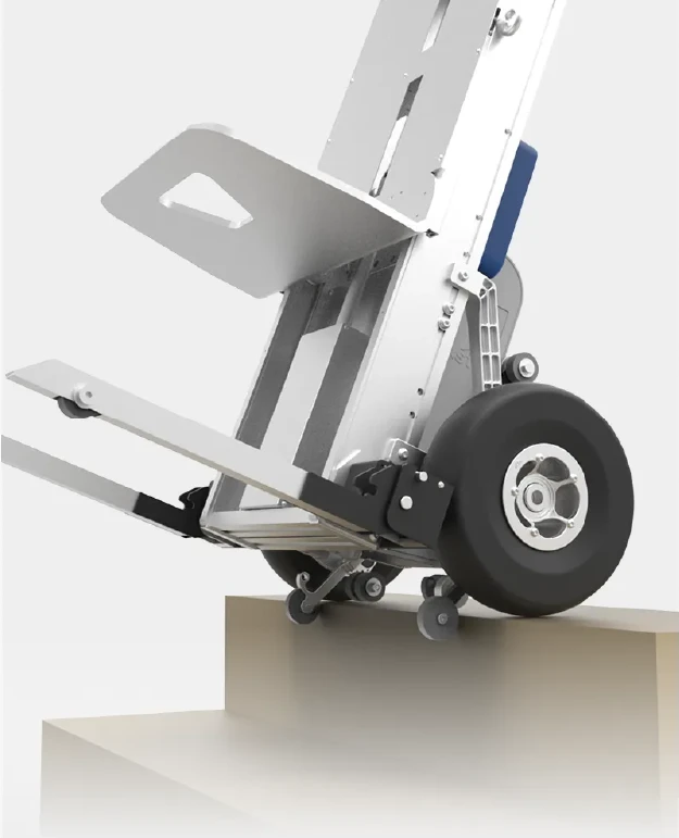 Carrinho elétrico sobe escadas para levantar pesos e cargas em escadas. Capacidade até 170kg. Com plataforma elevatória.