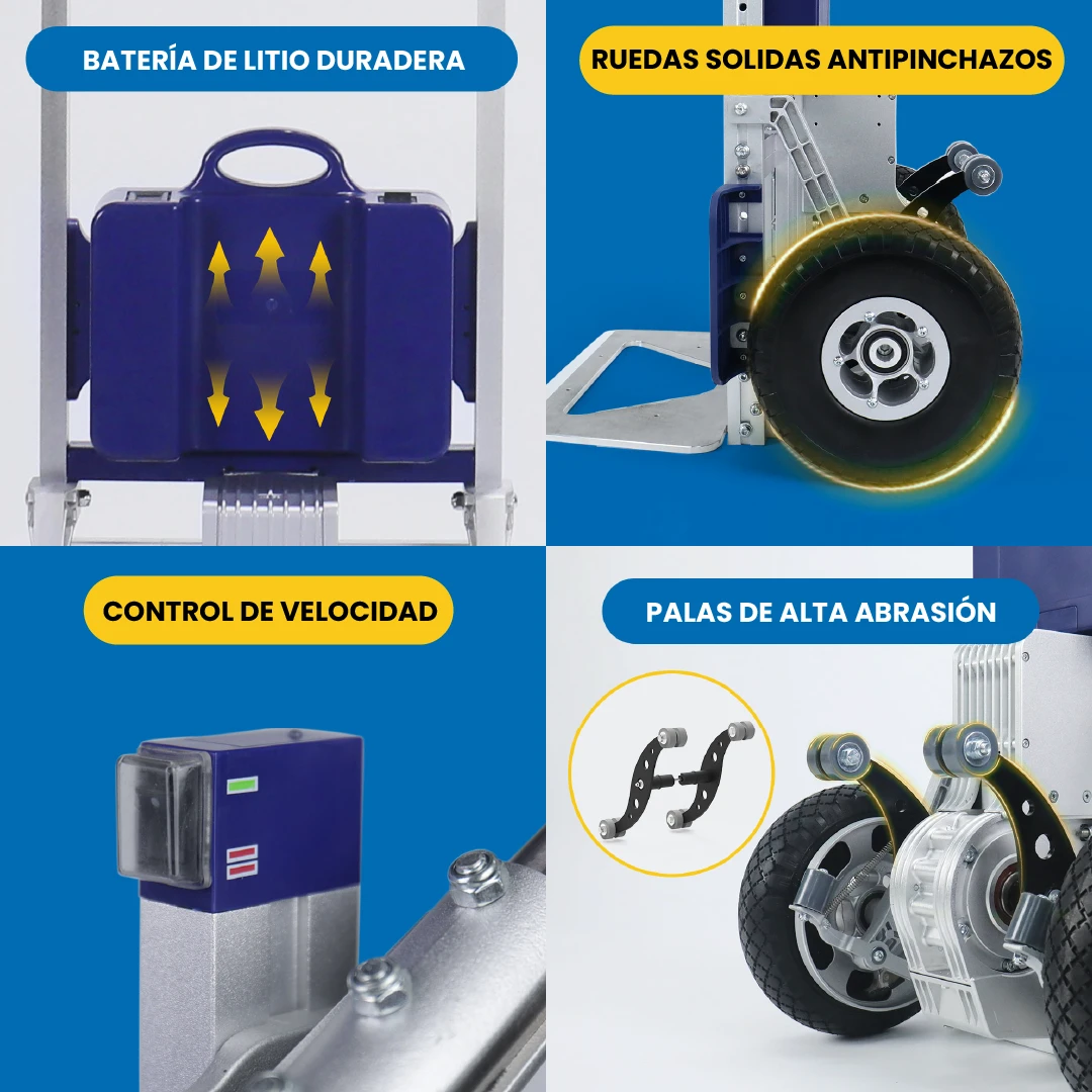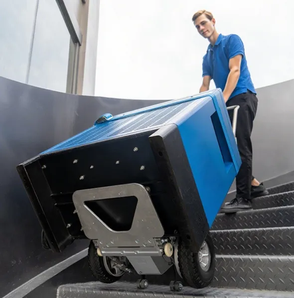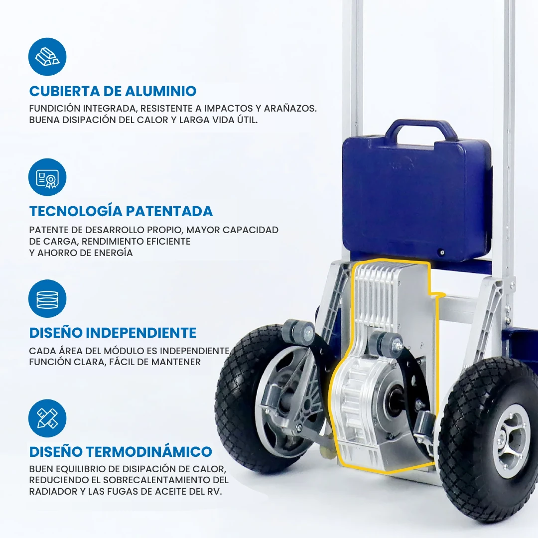 O trepador de escadas elétrico ZW7250GC integra um grupo motopropulsor desenvolvido pelo próprio com uma caixa em liga de alumínio. Tem uma estrutura forte e mais duradoura, com uma capacidade de carga até 250 kg. A máquina possui um sistema de travagem auto-desenvolvido para evitar o deslizamento e garantir a segurança ao subir/descer escadas.
